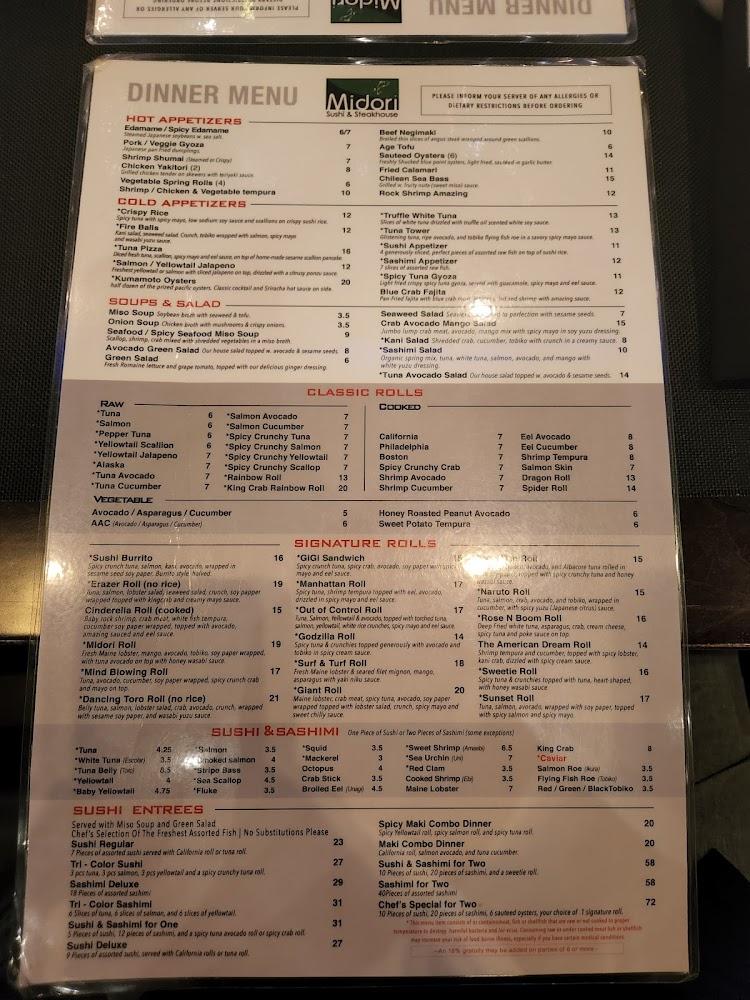 The menu at Midori Sushi & Steakhouse features an impressive range of Japanese dishes. Sushi lovers can indulge in several options, from classic nigiri to colorful rolls like the spicy tuna and crab stick offerings. Freshness is key, with high-quality fish sourced daily.